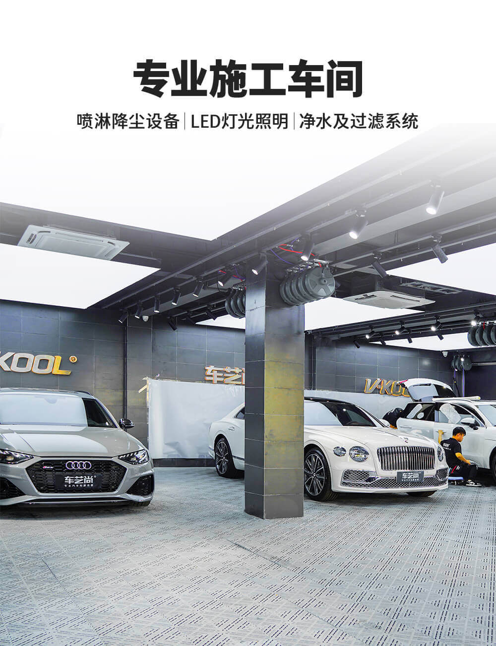 车艺尚萧山威固旗舰店配备了专业的施工车间,装备有大型喷淋除尘设施和大型LED无死角照明灯光系统,可以为您的爱车贴膜提供专业的场地条件支持
